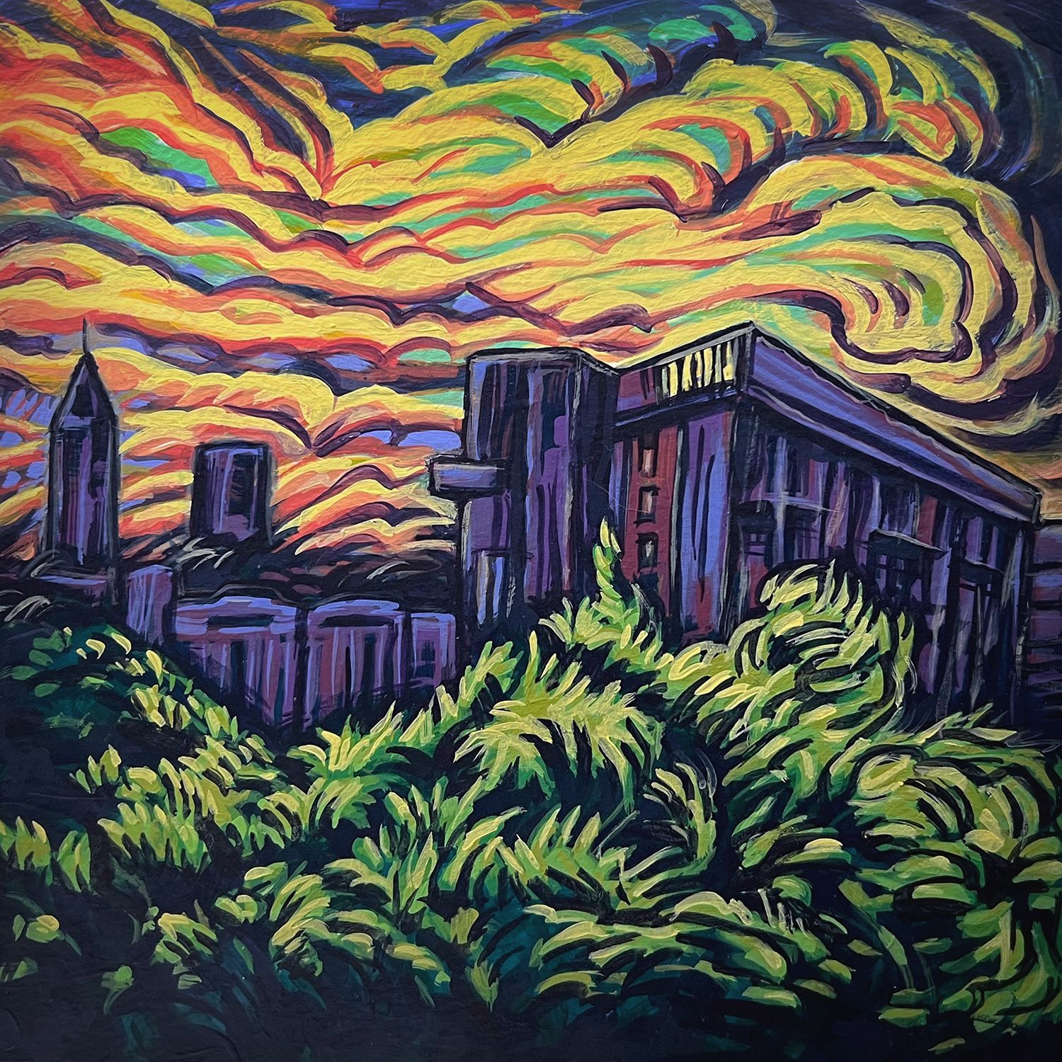 I painted this contemporary landscape for the 2022 'Dreamscapes' four-artist show. It depicts an intriguing view from Atlanta of the Cotton Mill building framed in the foreground by the Marta train track. Acrylic on Canvas | 12"x24"