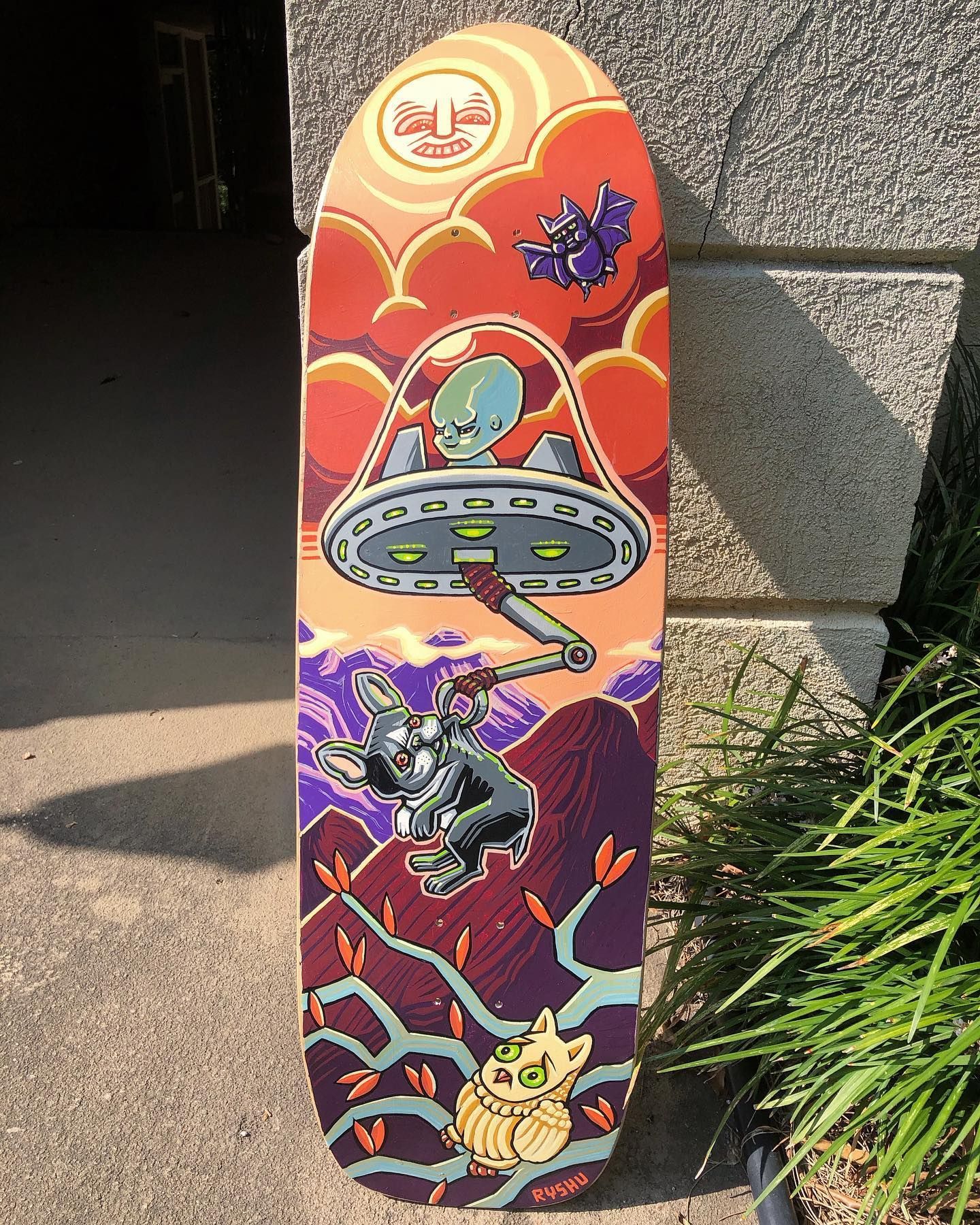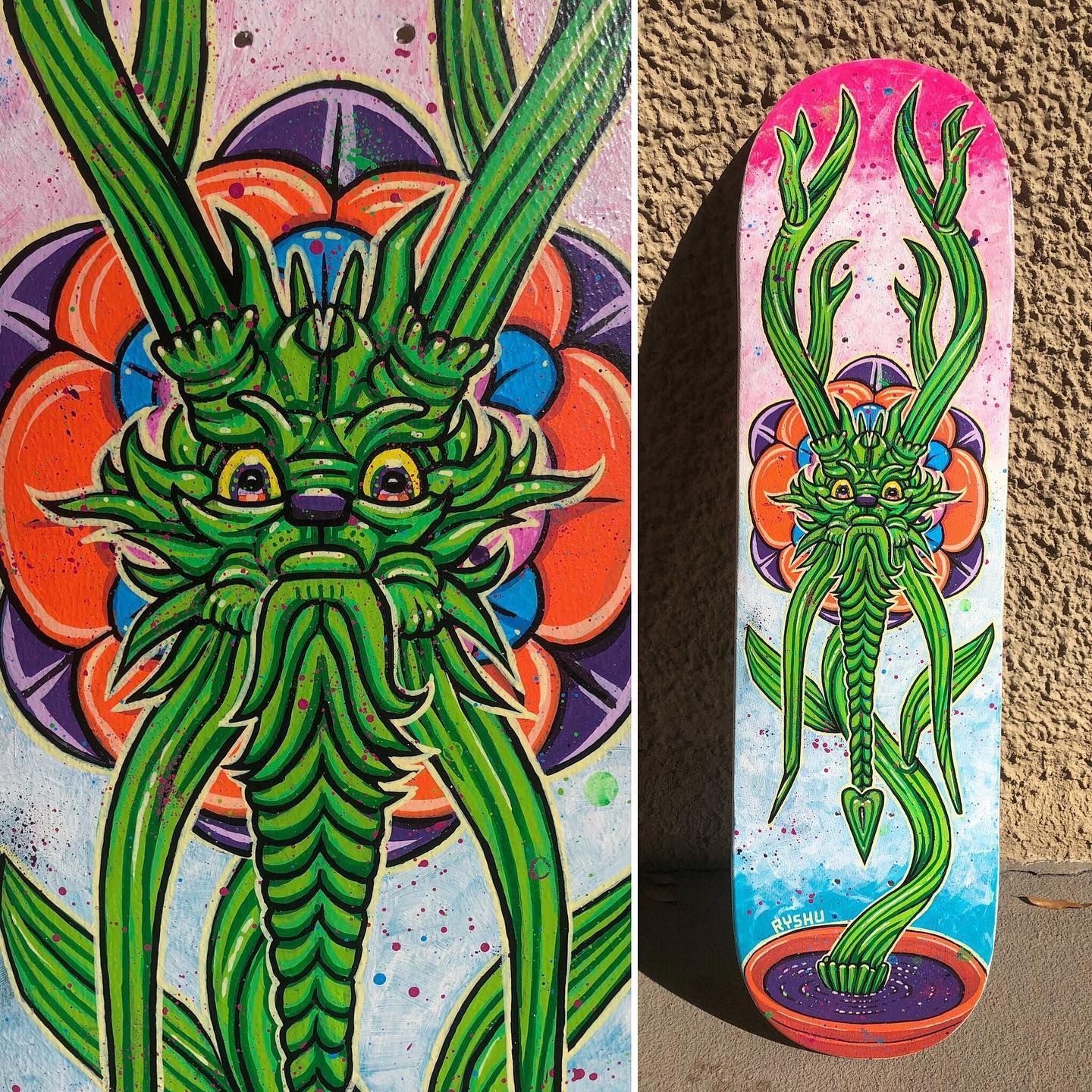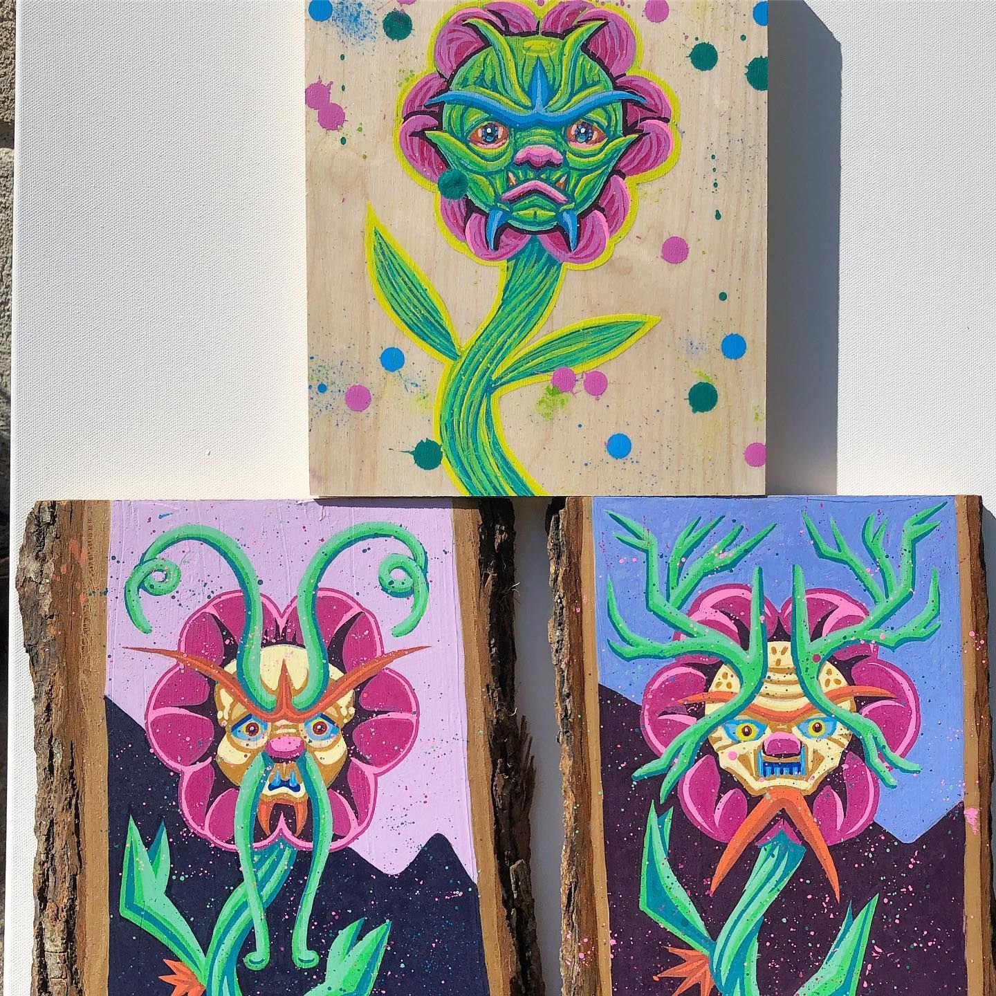 Painted for skate deck art show circa 2019. Features a new version of my Wyld Flower.