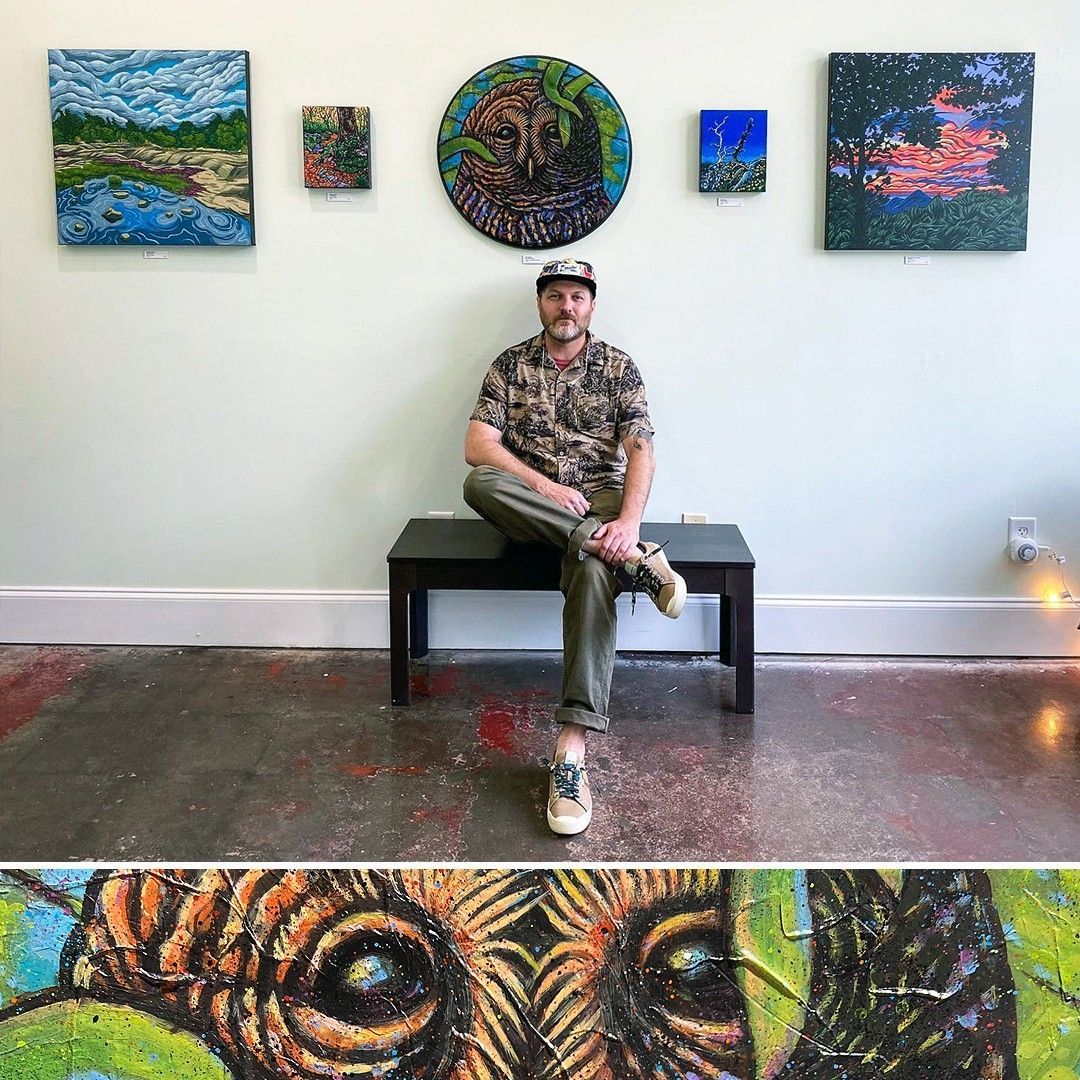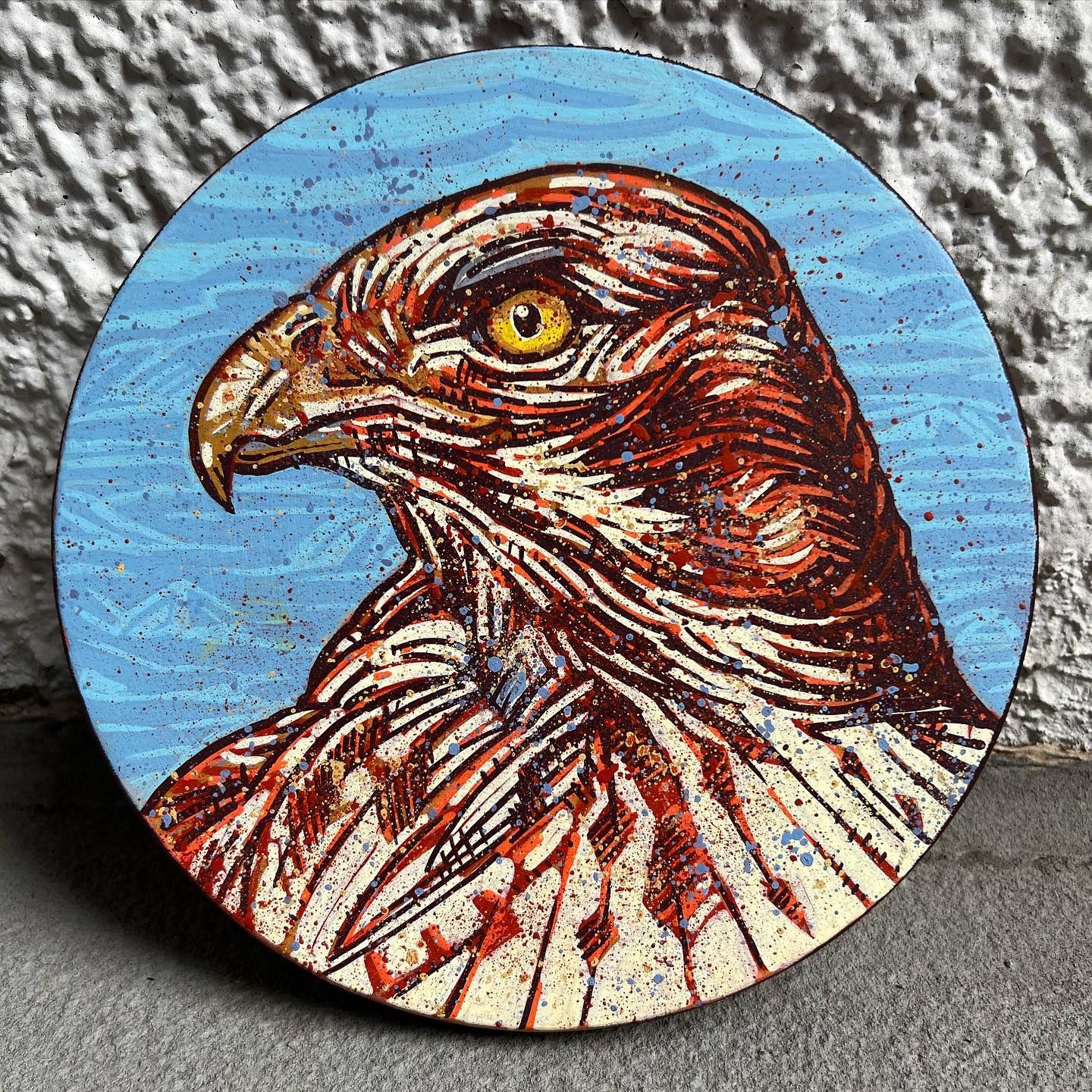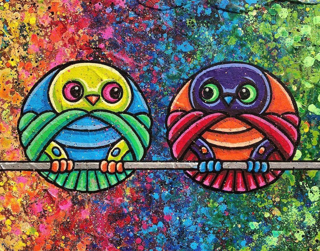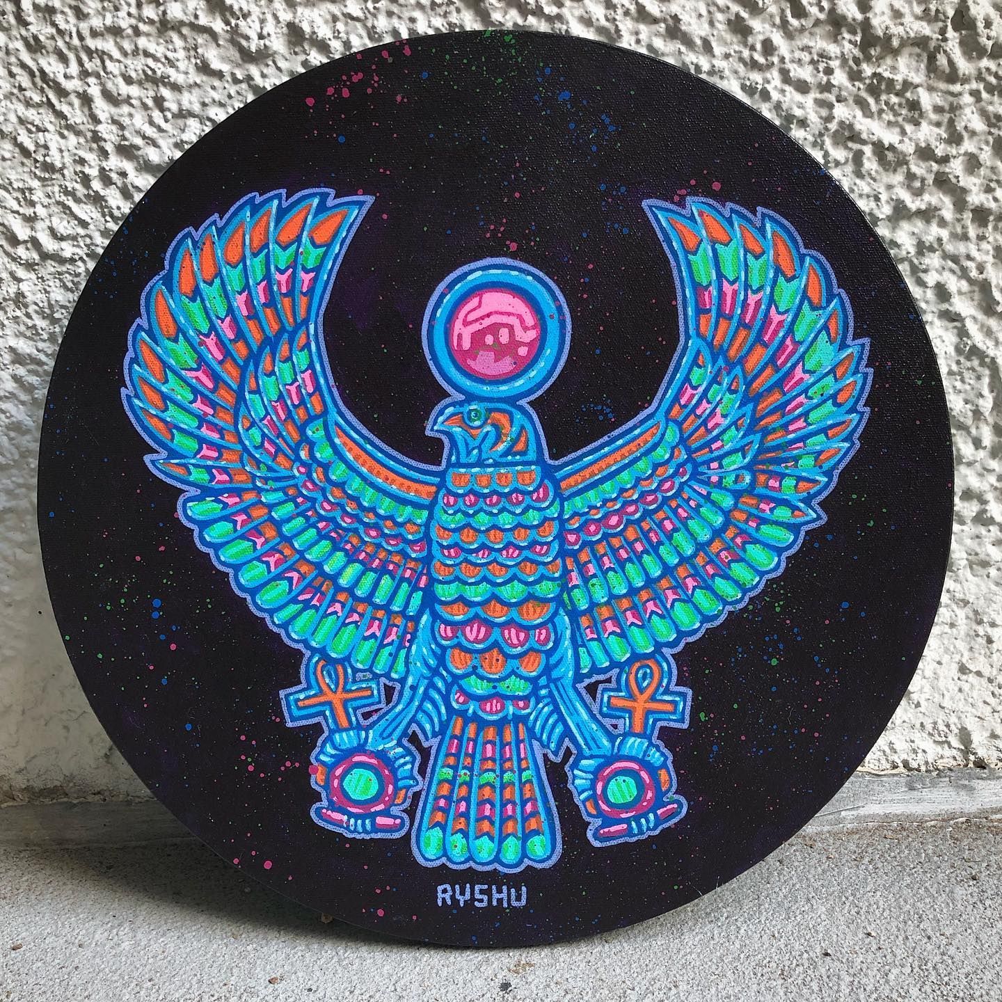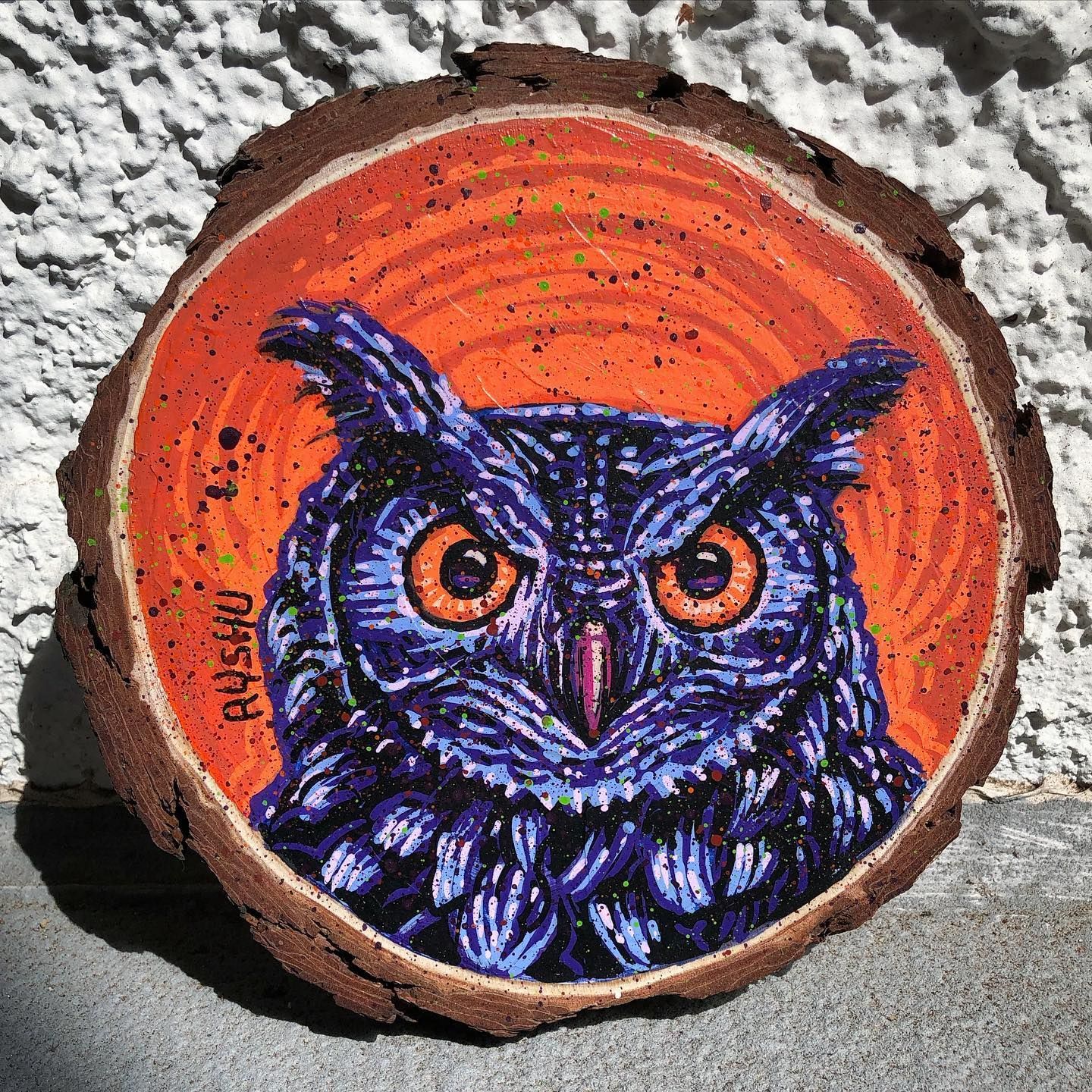 This was a fun painting commission featuring my orb owl motif. Acrylic on wood panel