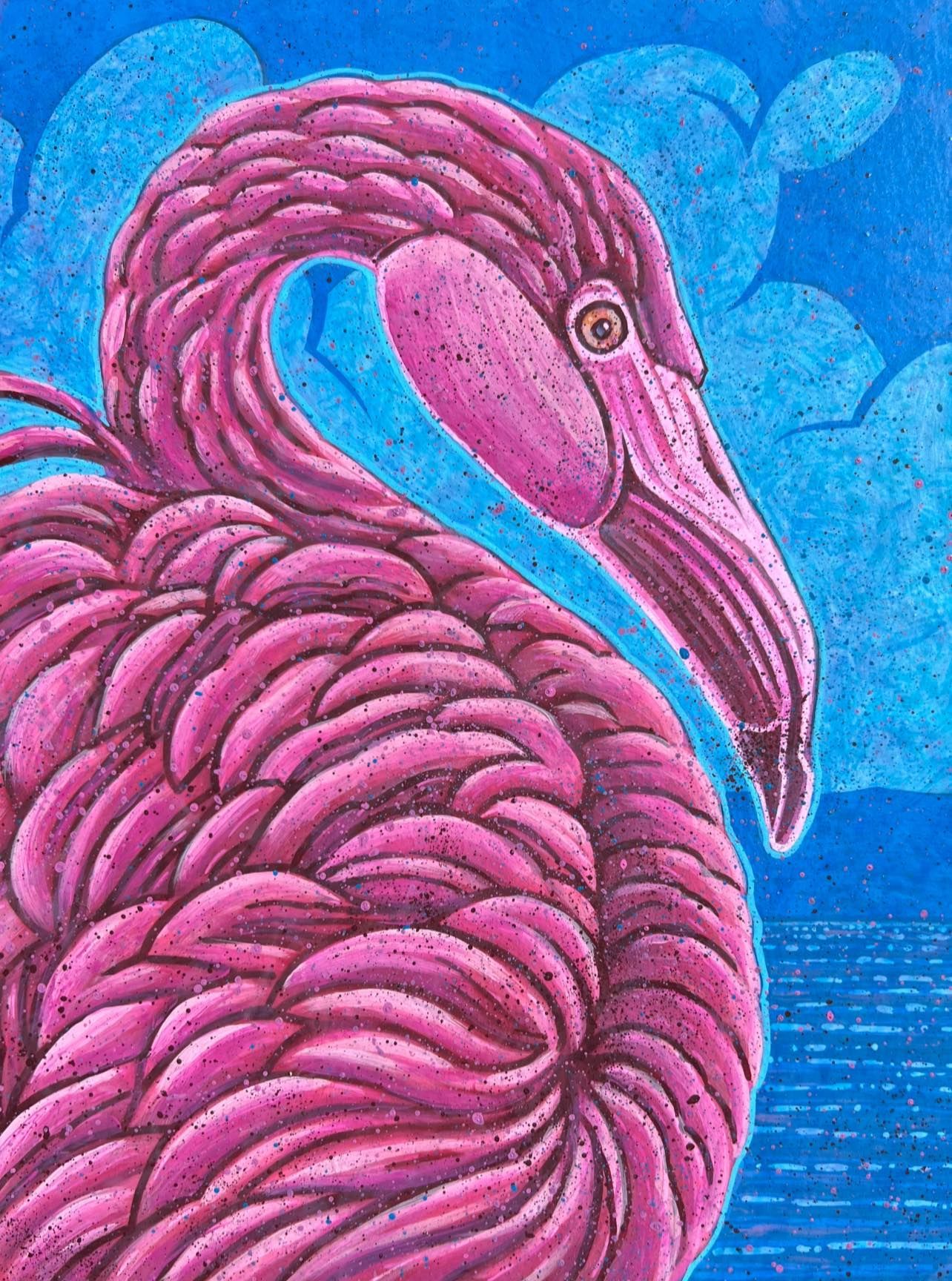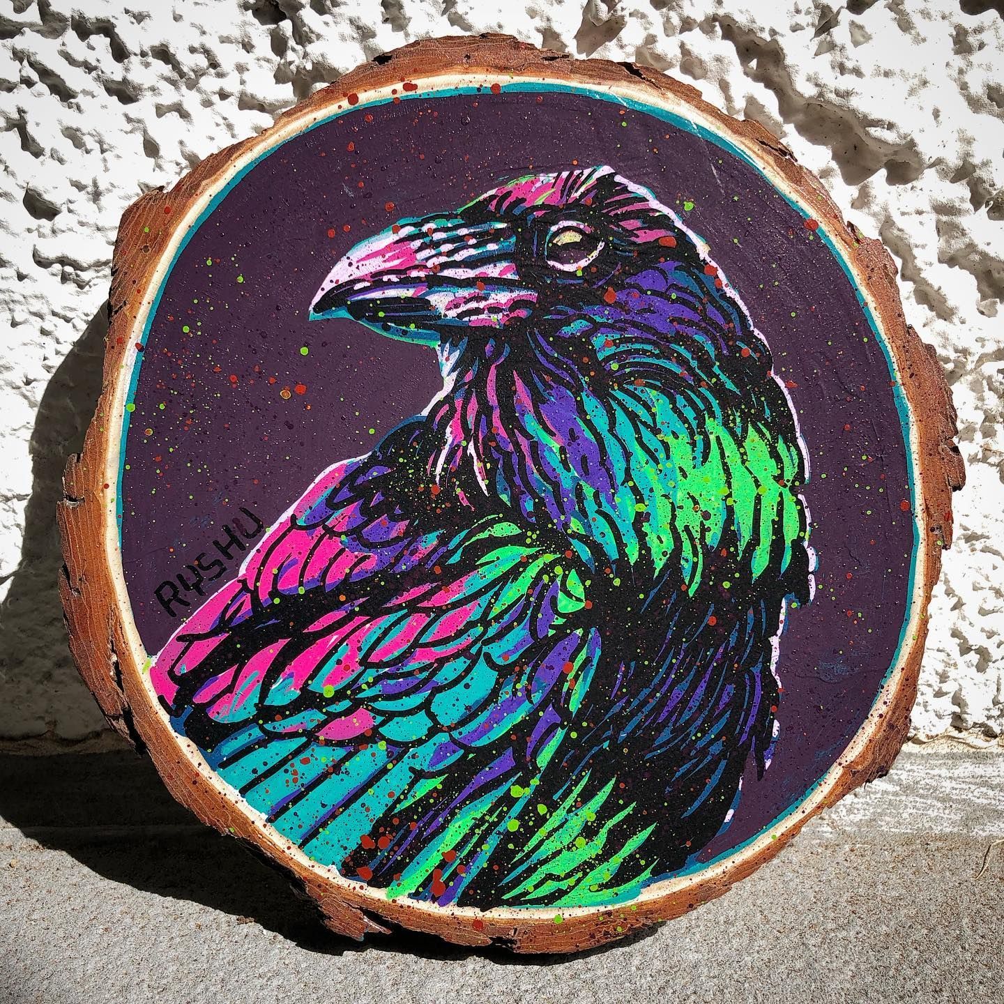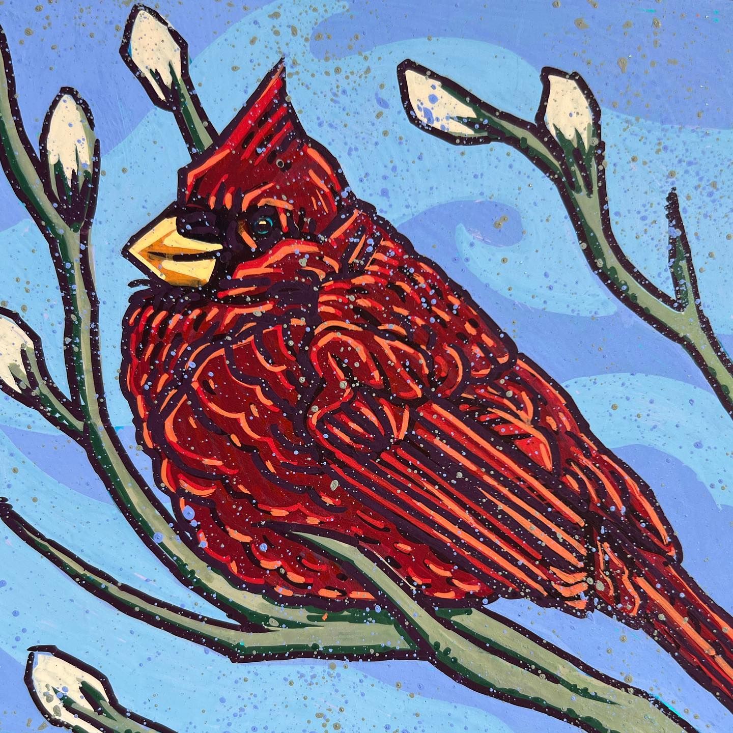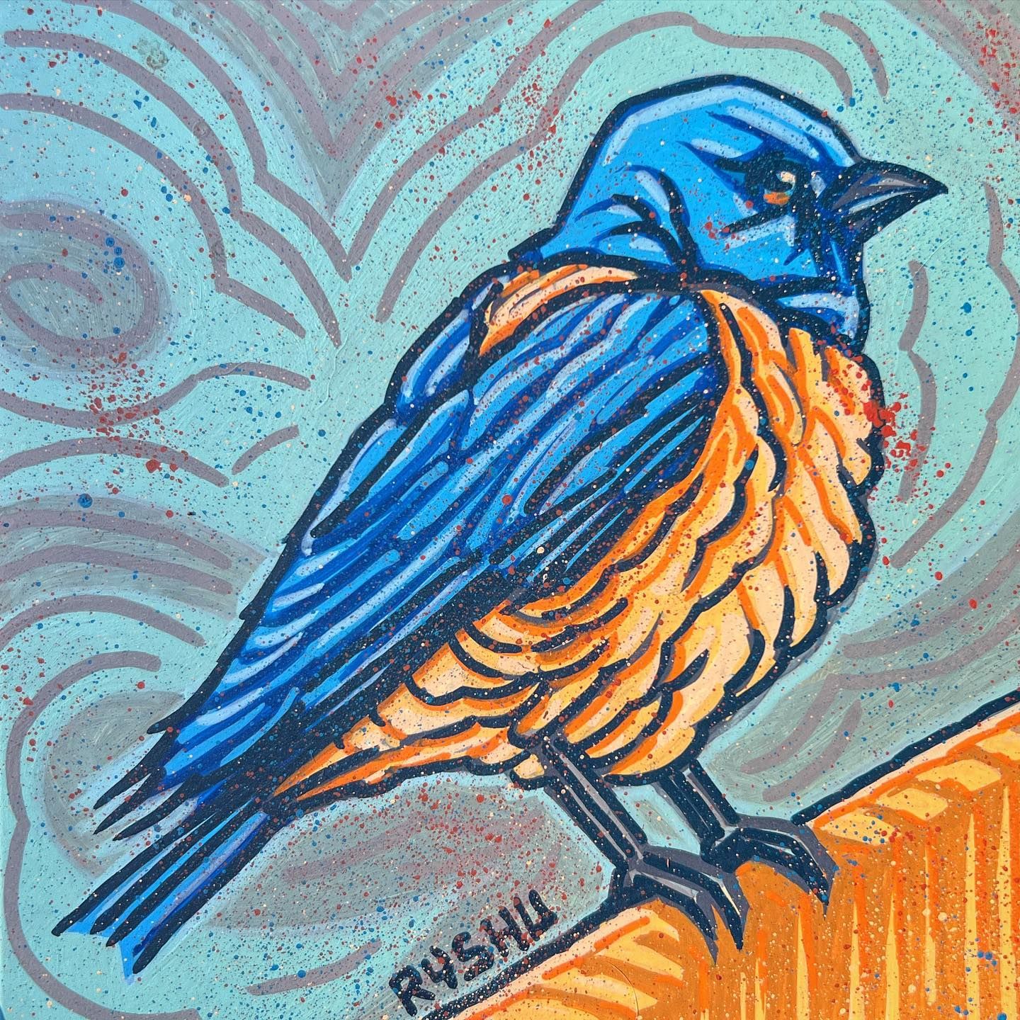 I had fun capturing the iridescent shimmer from the wing in flat paint. Acrylic on wood | 12'x12"