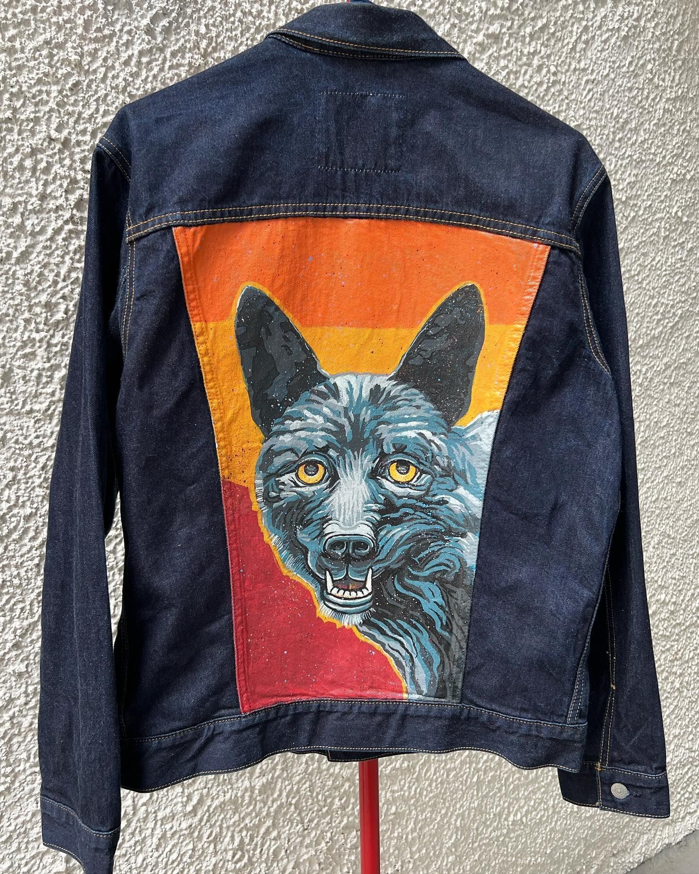 Jean Jacket painting featuring Carmine the black coyote who resides at Yellow River Animal Sanctuary. Acrylic paint on denim jacket. 2022